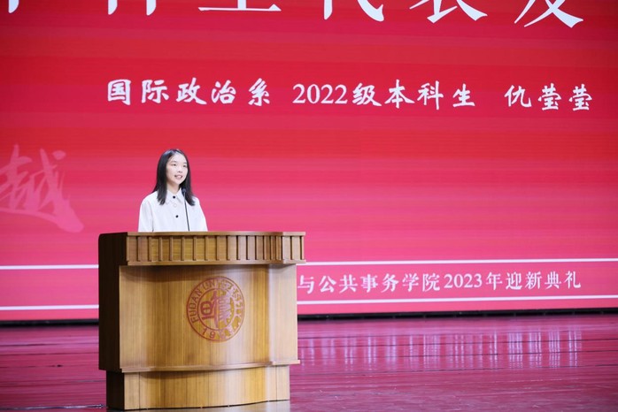 2022级国际政治专业仇莹莹代表本科生发言。仇莹莹同学从自己中学时期就萌发的“国政梦”谈起,分享了她在社会科学试验班一年中学习专业课程、参与国务学院经典项目YICGG、与身边以及来自世界各地的青年交流的经历。她将自己和国务同辈的故事串联起来,把国务学子饱含的热情、闪耀的特质概括为“一个共同目标、一种共同追求,一颗服务国家利益、追求世界繁荣的‘公心’”,表达了在未来不断努力,成长为具有精神力量的合格国务人的愿望。