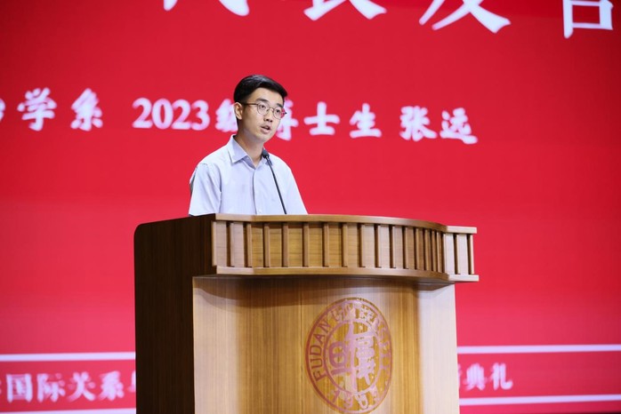 2023级政治学系博士生张远作为研究生代表发言。从孙关宏老师主编的《政治学概论》为他打开了政治学的“兴趣之门”开始,张远分享了自己追星般的“旁听”历程和与同学们讨论、交流、共读的乐趣。他认为,成长为“卓越而有趣”的人,不仅仅是使自己成为“君子”“全面发展的人”,更是要谨记“为全体人民谋幸福”的初心,这是每一名国务学子应担的重任与使命。