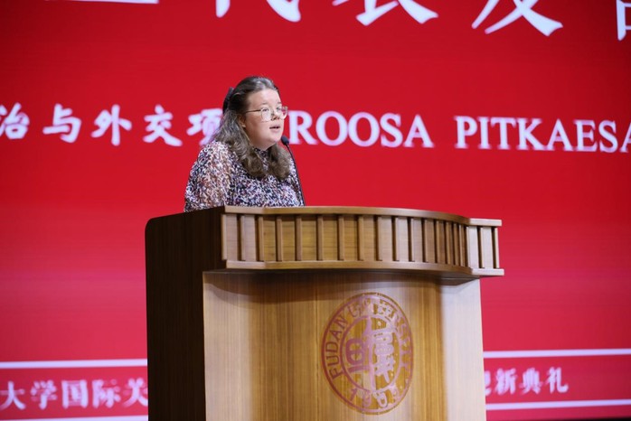 来自芬兰的2023级CPD中国政治与外交项目项目博士生ROOSA PITKAESALO作为留学生代表分享了自己的求学历程。她来到复旦,既是因为她自小就对中国十分感兴趣,更是因为复旦先进的校园设施和顶尖的教学团队深深吸引着她。她十分珍惜在国务学院的学习机会,并期待在复旦读书期间,在与良师益友的交流沟通中,可以加深不同文化之间的联系。