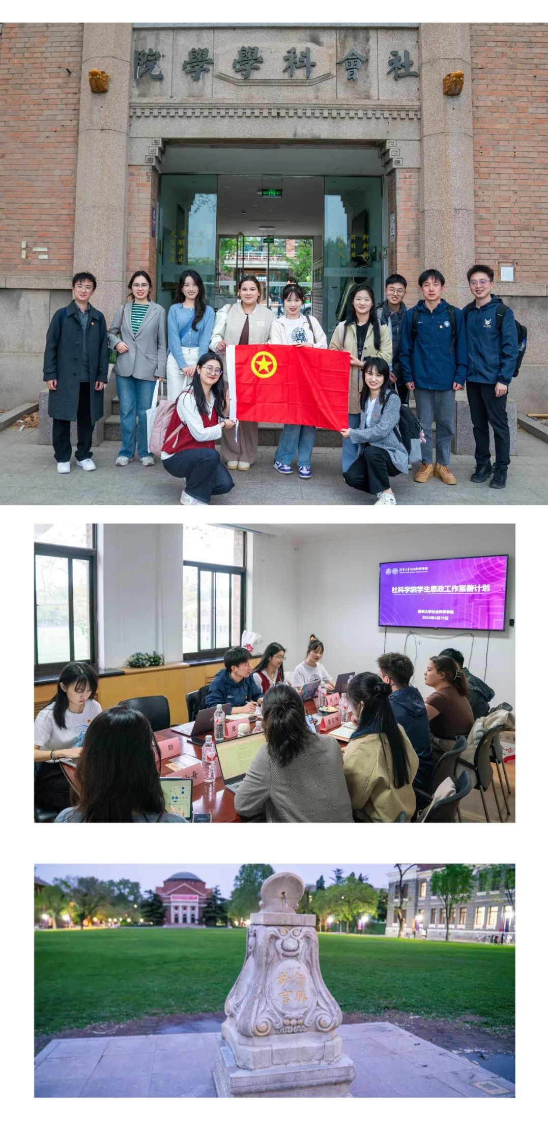 在清华大学社会科学学院,调研团队与学院团委书记李宗阳、团委副书记王芳倩、林小文、刘志鹏、李小舟以及院学生会主席团成员尤丽娅进行座谈交流,重点就品牌项目建设、骨干培养、实践、体育等方面工作的特色做法进行学习。会后,调研团队参访了清华大学社会科学学院和清华校园。