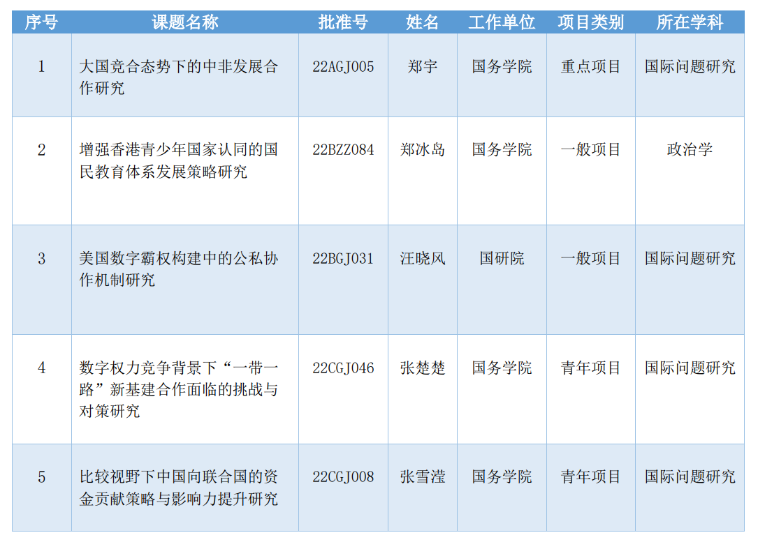 2022年国家社科基金年度项目和青年项目按照规定程序,顺利完成评审立项工作并向社会公布。 电影网站 政治学高峰学科有5项科研项目入选,包括1项重点项目、2项一般项目、2项青年项目,具体情况如下: