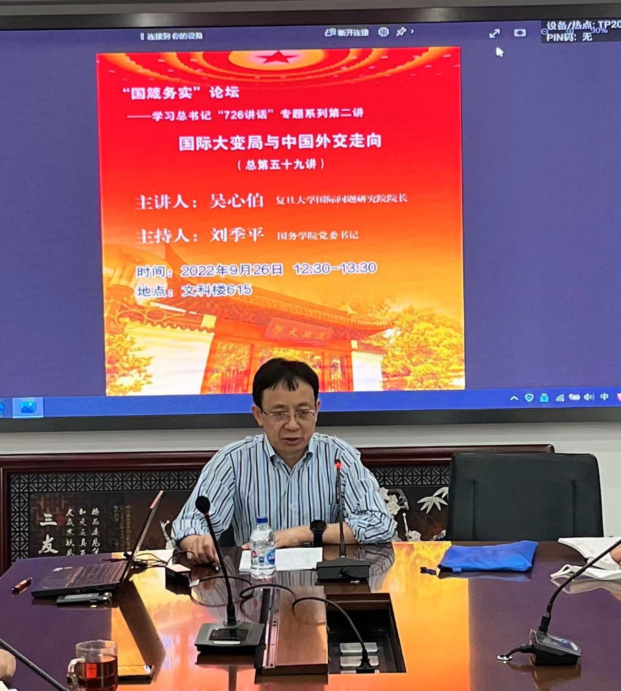 2022年9月26日, 电影网站 党委成功举办国箴务实第59讲。本次讲座是国务学院党建品牌“国箴务实”论坛学习贯彻习近平总书记“7·26”重要讲话精神系列讲座的第二讲,由吴心伯教授主讲,主题是:国际大变局与中国外交走向。刘季平书记主持本次讲座,学院党委中心组成员和师生党支部骨干参与。