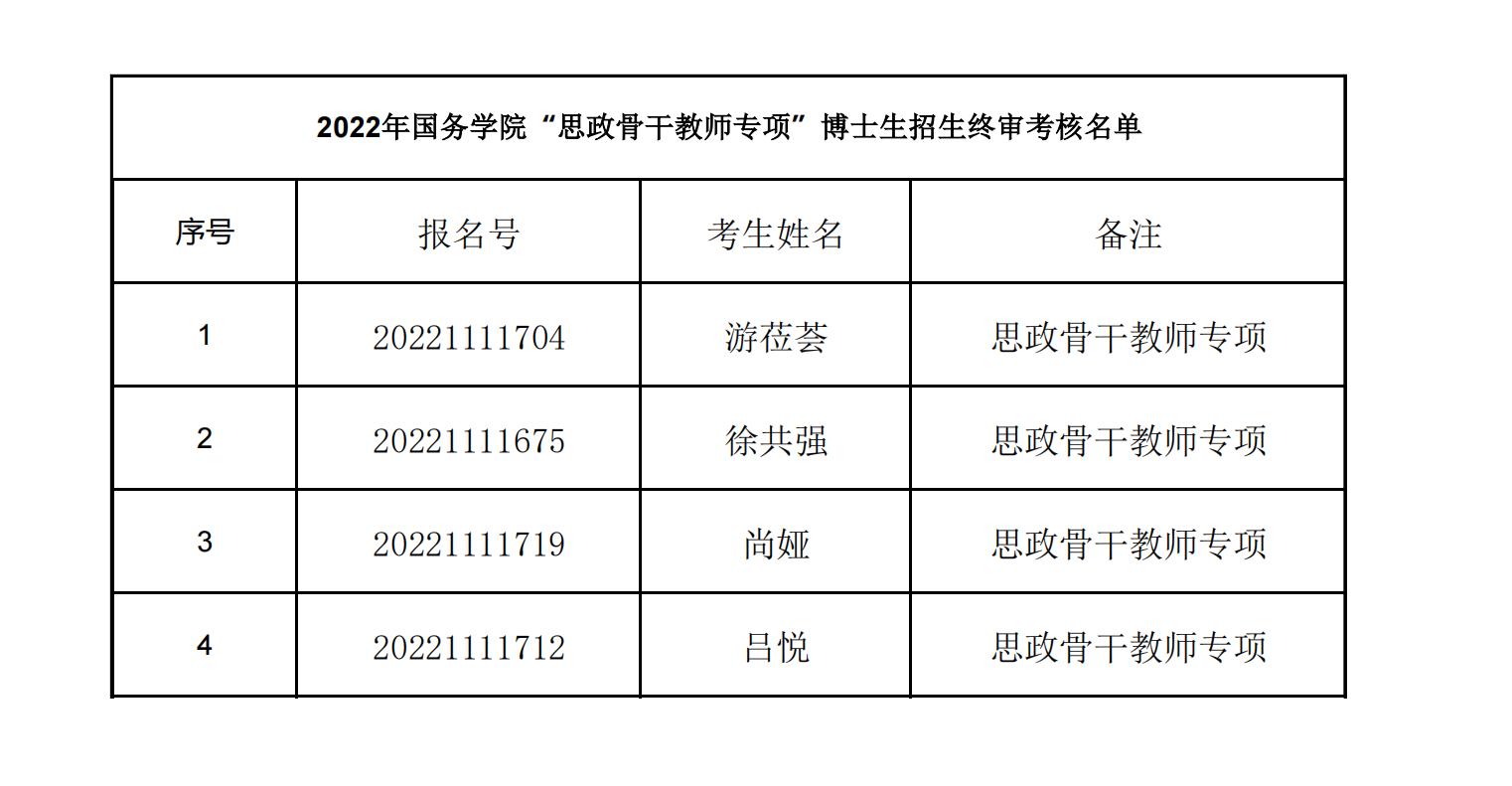 2022年国务学院“思政骨干教师专项”博士生招生终审考核名单