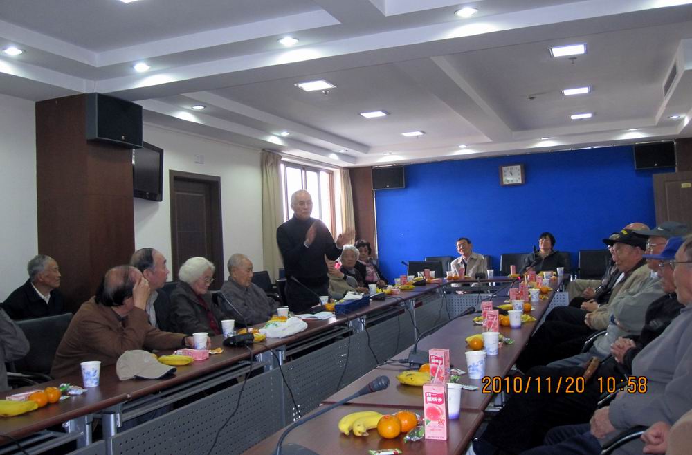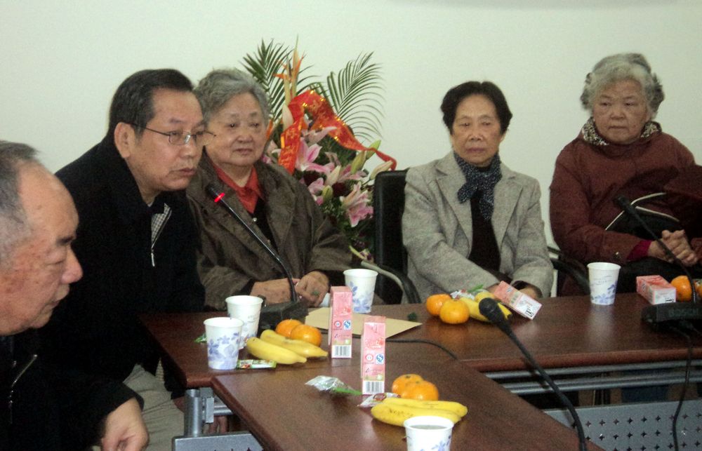 (10)居住在广州的1965级院友曾云玉(左1)听说母校举办活动,便乘火车匆匆赶来。她站起来激动地说:“不请也要来!国政系不仅是学知识的课堂,而且是团结友爱的集体、温馨的大家庭。”她牢记“要做有用的人才”的教导,工作兢兢业业,任劳任怨,多次被评为优秀共产党员和先进工作者。最后她放声演唱了一首粤语康健延寿歌,献给老寿星余开祥老师。 右1和右2分别为1965级院友胡巾雄、谈仪珍。