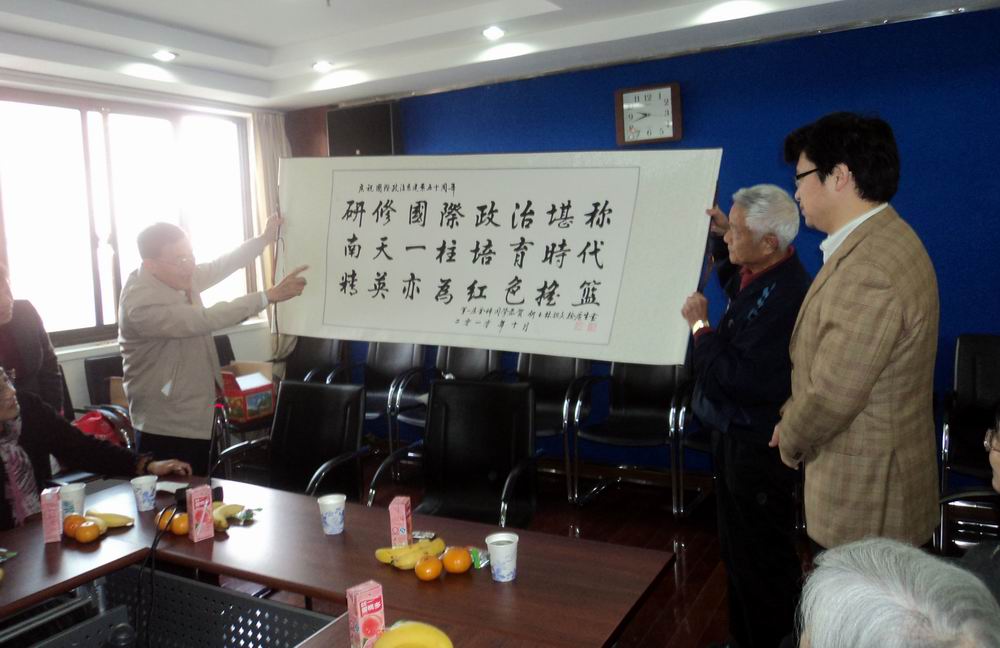(2)1965级院友代表李元茂(副教授、 电影网站 分校原党委副书记)(左1)和张金芳(副教授、 电影网站 分校原副院长)(右2)向国务学院领导林尚立(右1)敬赠对联“研修国际政治堪称南天一柱,培养时代精英亦为红色摇篮”(1965级院友:文汇报资深记者何玉林撰联,山东大学党委原副书记徐广生书写)。