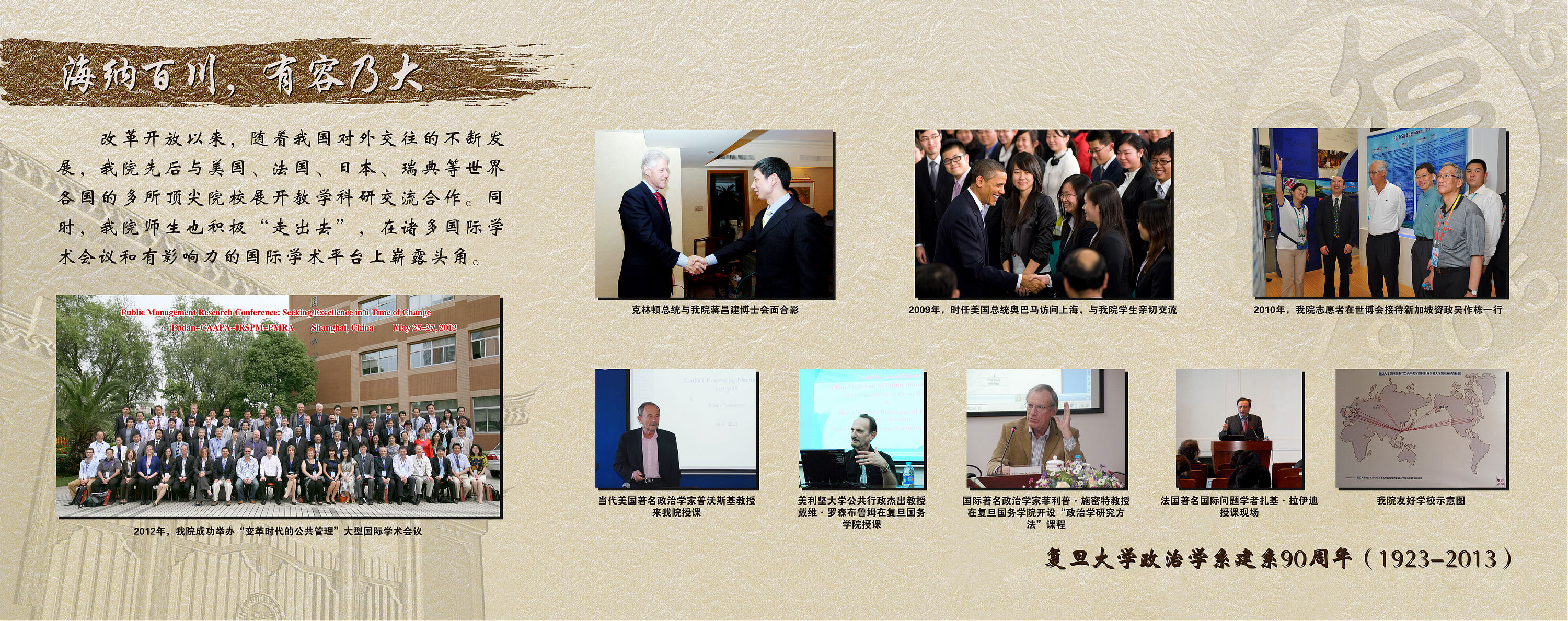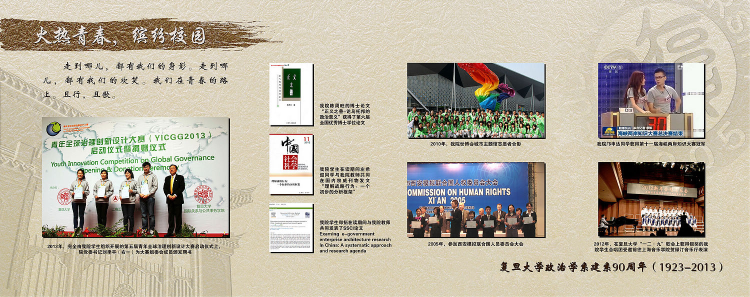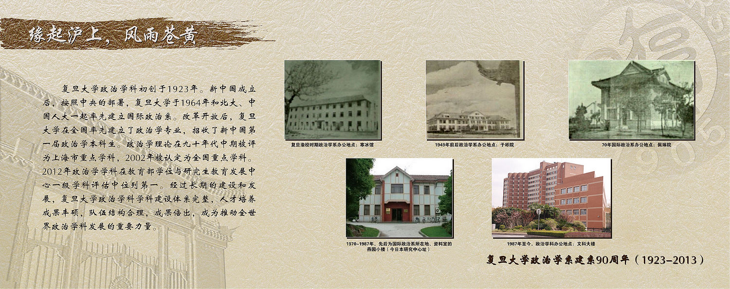 政治学系建系90周年(1923-2013) 复旦政治学系,发轫于旧时代风雨晦暗之际,筚路蓝缕,创业艰难。再经新政权重整山河之时,风云际会,跌宕起伏。幸得复兴于国家改革开放之后,薪火传承,开拓新篇,终成今日蔚然大观。纵览九十载沧海桑田,莫不与家国天下命运相联。 复旦政治学系,近百年精进不懈,以坚忍之努力问道政学之经纬,以辛勤之耕耘作育海内之英才,以良苦之用心关怀国家之福祉。兼具精英意识与大众情怀,读经问典,教学相长,遂得桃李天下;务求独立精神与自由思想,经世济民,学以致用,乃有道德文章。 复旦政治学系,载厚重历史之积淀,谱杨柳新枝之词曲。前辈苦心经营之事业,正是我辈奋发进取之根基。面对世界浩荡潮流,怀抱民族复兴梦想,政治学系必将承前启后,矢志不移,砥砺前行,和衷共济!凭此卓越信念与光荣使命,定能代代相传,生生不息,同享日月光华,旦复旦兮! |