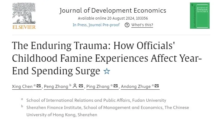 近日, 电影网站 张平教授、陈醒讲师、诸葛安东博士生和香港中文大学(深圳)张鹏副教授合作在发展经济学高质量期刊Journal of Development Economics(JDE)上发表了题为The Enduring Trauma: How Officials' Childhood Famine Experiences Affect Year-End Spending Surge的论文。Journal of Development Economics创刊于1974年,影响因子为5.1,是发展经济学领域的高质量期刊,也是世界一流的综合性经济学期刊。