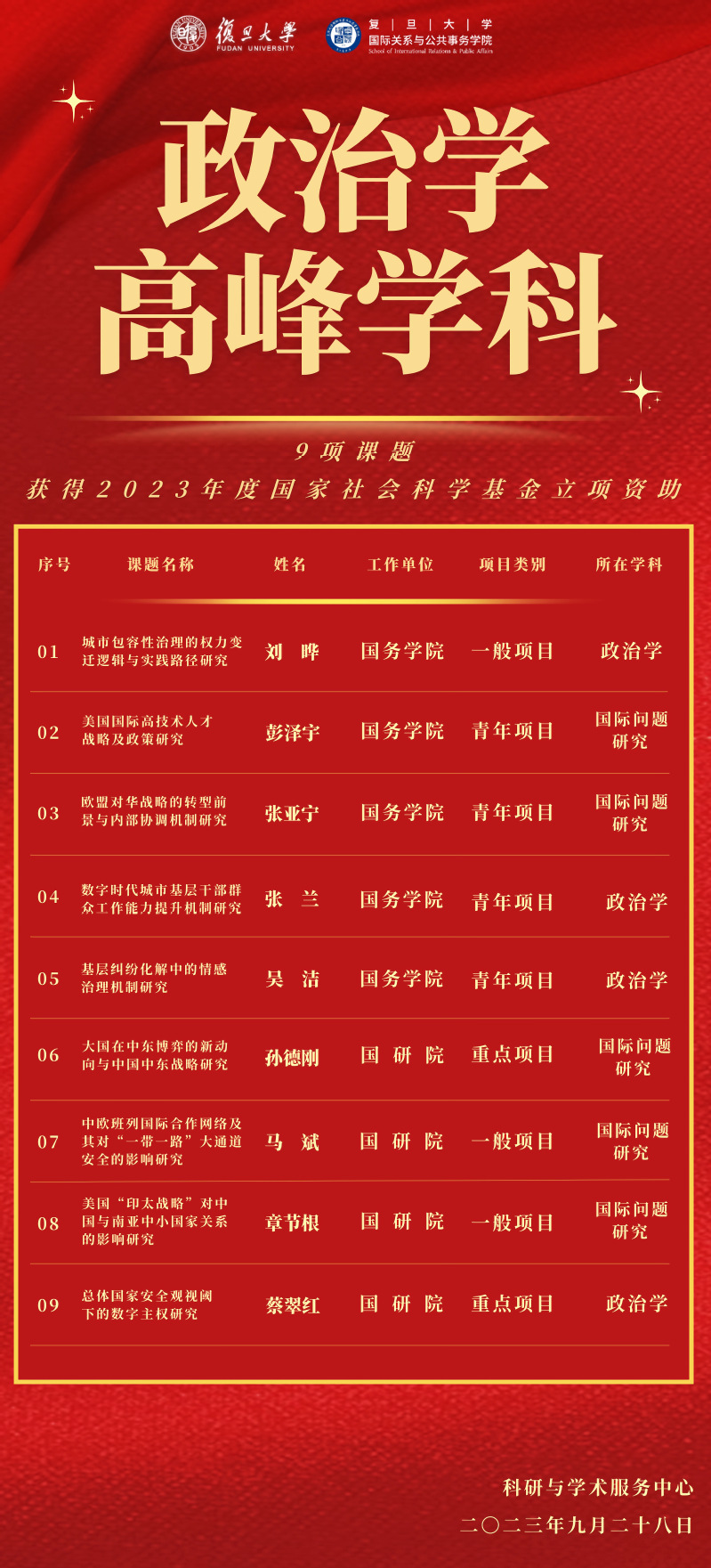 2023年国家社科基金年度项目和青年项目按照规定程序,顺利完成评审立项工作并向社会公布。 电影网站 政治学高峰学科有9项科研项目入选,包括2项重点项目、3项一般项目、4项青年项目,具体情况如下: