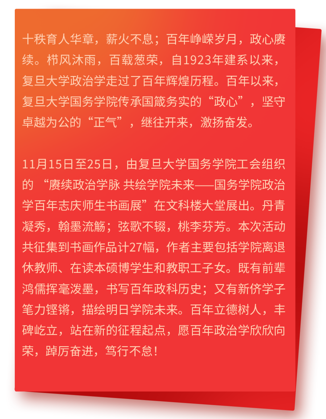 方寸之间勾勒百年政治学人风貌,撇捺行顿书尽百年政治学科征途。前辈鸿儒,史册留名;后生莘莘,英才辈出。百年政治学科,正是风华正茂,国务学院始终秉承“团结、服务、牺牲”的复旦精神,践行“博学而笃志,切问而近思”的校训宏旨,以“国箴务实,卓越为公”的国务精神为指引,作育国士,立德树人。一代代国务人投身时代洪流,踔厉奋发,接续奋进,久久为功。