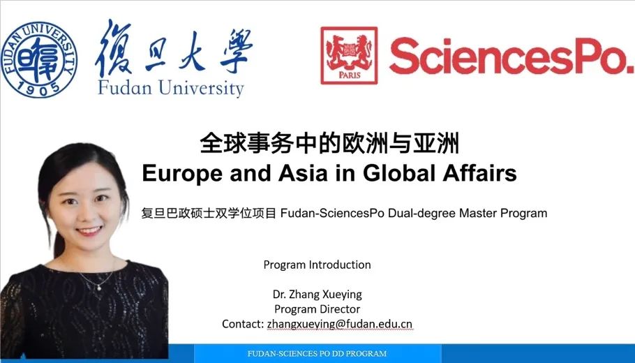 “国际事务中的欧洲与亚洲”英文双学位硕士项目主任张雪滢对复旦-巴政双学位项目的开设历程、培养目标和课程架构进行了介绍。该项目在录取上“优中选优”,期待“百花齐放”,培养深耕全世界中欧关系领域的青年人才。