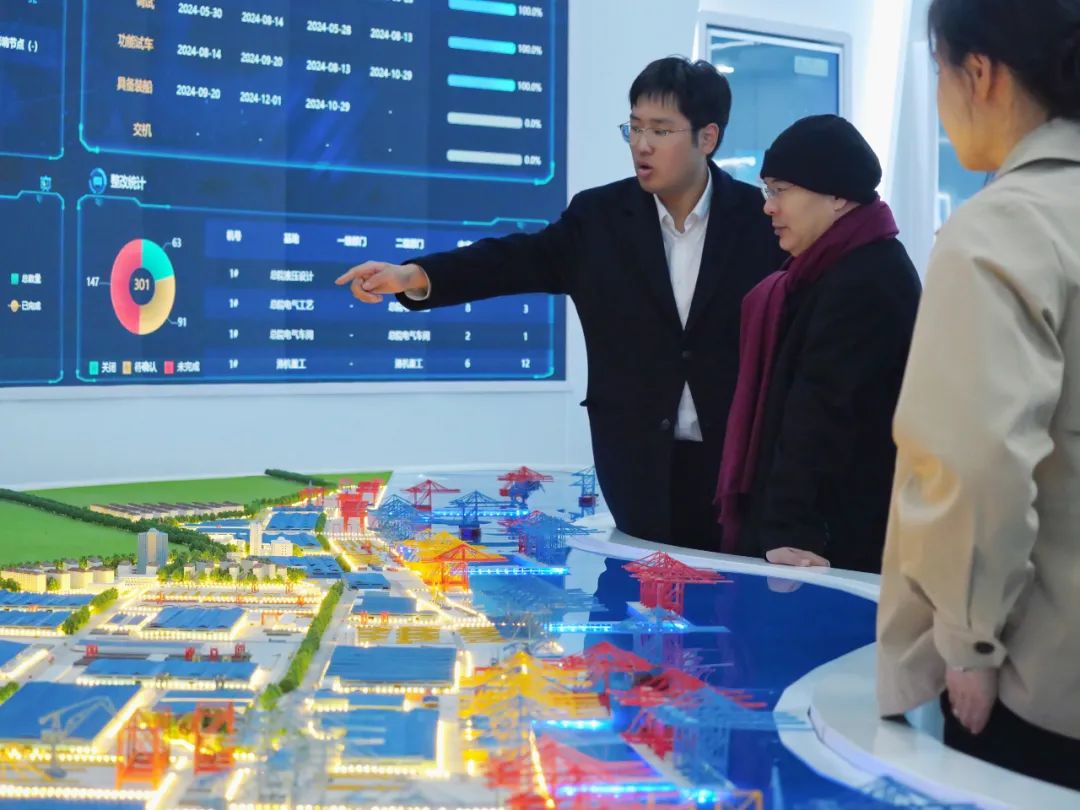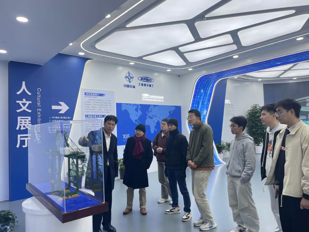 随后,师生团队来到振华重工数字化展厅内,同学们通过展板介绍了解到了振华重工从杰出民族企业成长为改革开放先锋,再到成为新时代创新引领者的辉煌历程,体会到了创新之于企业长远发展的重要性。当听到振华重工承接的地震带建桥项目介绍时,大家更为中国企业在复杂地质条件下的技术攻关能力所折服。这种世界级的工程实力,让各位同学深切感受到了中国式现代化进程中科学技术产业强大的助推作用。
