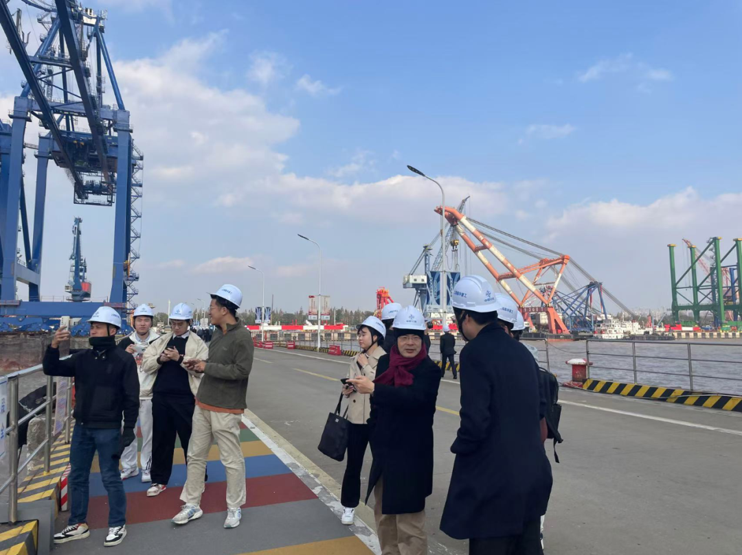 活动伊始,师生团队前往零号海工码头参观考察码头的建设情况与港机设备的制造状况。作为中交集团装备制造板块的核心企业,振华重工以“全球贸易之臂”连通东方海港与世界,已经成为全球最大的港机设备制造商,成为我国“民族工业的一面旗帜”。在振华重工讲解员老师的介绍中,同学们了解到振华重工的发展历程、核心技术以及在全球重工领域的卓越成就。当同学们仰望到排排巍峨耸立的岸桥时,讲解员老师深情且自豪地说道,振华重工的产品已经出口到107个国家和地区,全世界约300座港口和码头都能看到振华重工的标志(ZPMC),其中,振华重工的岸桥产品一直占据全球市场份额的70%以上,长兴分公司也因此成为目前世界上最大的港口机械装备制造生产基地。这展现了企业追求卓越、勇于创新的精神风貌,以及将民族品牌推向世界之巅的坚定信念——“凡有集装箱作业的港口,必有振华港机的身影”。
