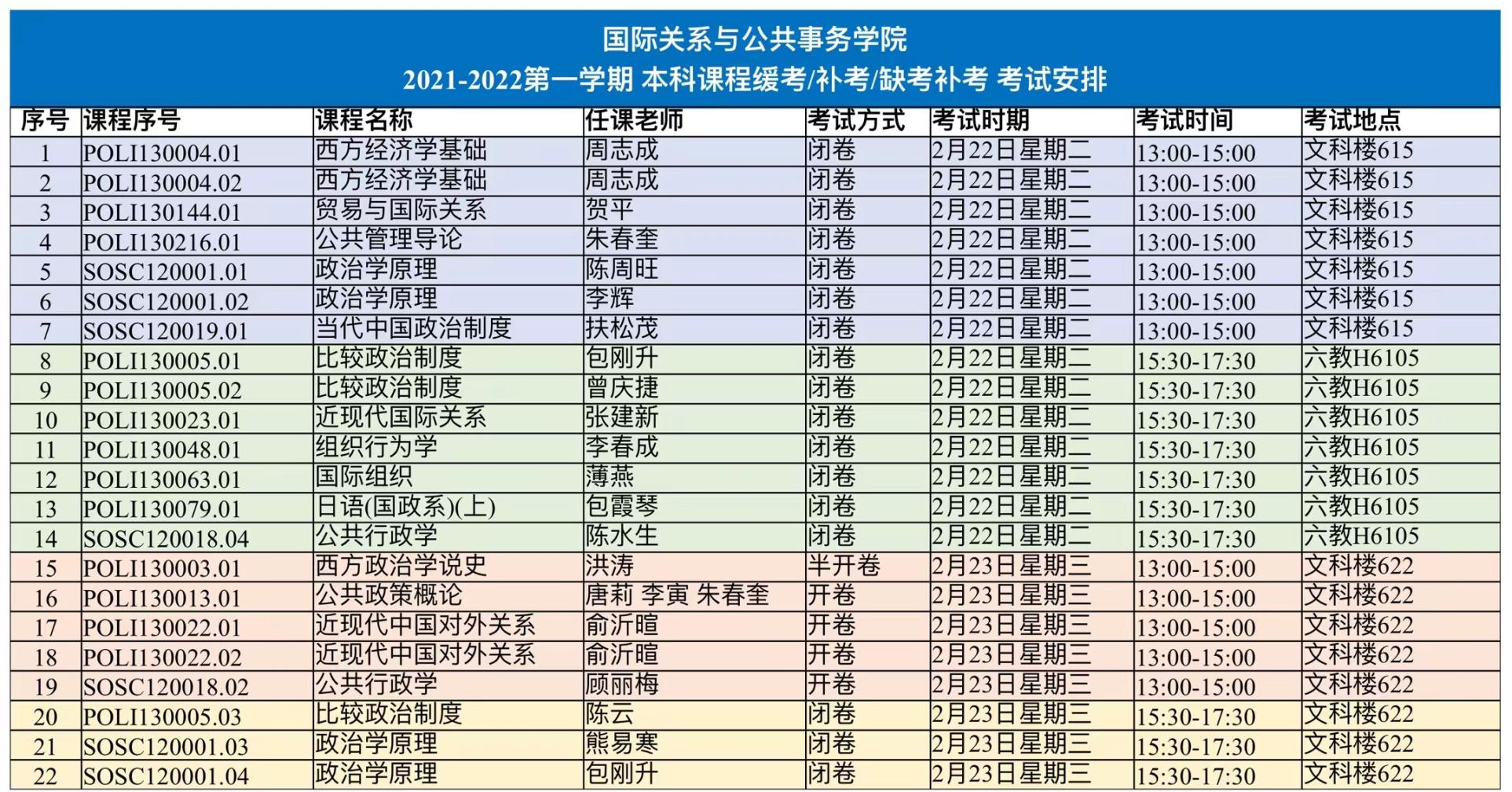 2021-2022学年第一学期国务学院本科科课程补缓考安排请见附图,相关考试安排已通过邮件发送至全体已申请缓考/补考/缺考补考同学的学号邮件,如尚未收到或学号邮箱不能接收邮件,请及时邮件联系电影网站 本科教务中心,联系方式:[email protected],电话:55664294。