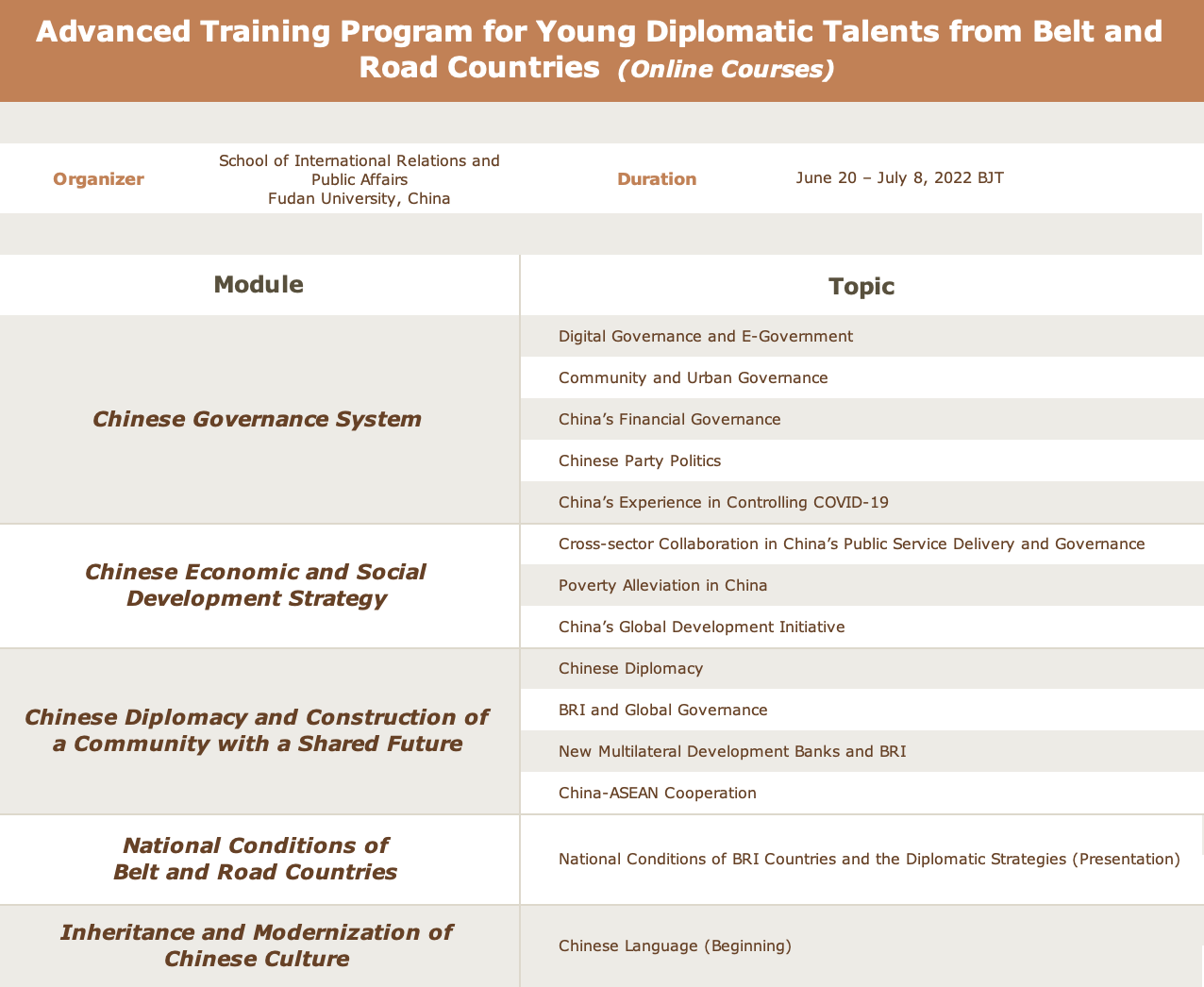 The curriculum is comprised of five modules: Chinese Governance System, Chinese Economic and Social Development Strategy, Chinese Diplomacy and Construction of a Community with a Shared Future, National Conditions of Belt and Road Countries, and Inheritance and Modernization of Chinese Culture. The Program takes the form of lectures, seminars and workshops. Leading experts, senior diplomats and practical specialists may be invited. The working language of the Program is English.