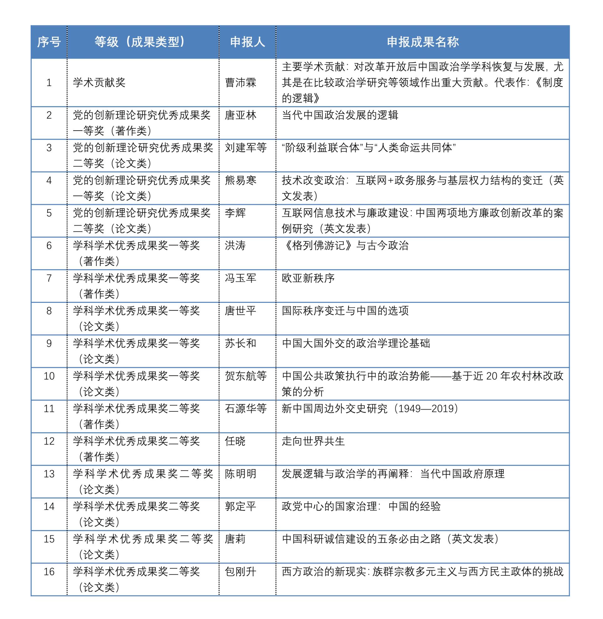上海市政治学高峰学科16项成果获得上海市第十五届哲学社会科学优秀成果奖,包括学术贡献奖1项,党的创新理论研究优秀成果奖4项(一等奖2项,二等奖2项),学科学术优秀成果奖11项(一等奖5项,二等奖6项)。其中, 电影网站 12项成果获奖,国际问题研究院3项成果获奖,社会科学高等研究院1项成果获奖。
