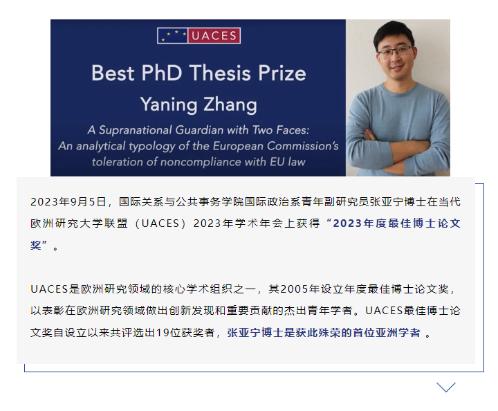 此次张亚宁博士的获奖论文为《超国家监护者的两面性:对欧盟委员会策略性容忍违规行为的类型学分析》(A Supranational Guardian with Two Faces: An analytical typology of the European Commission’s toleration of non-compliance with EU law)。
