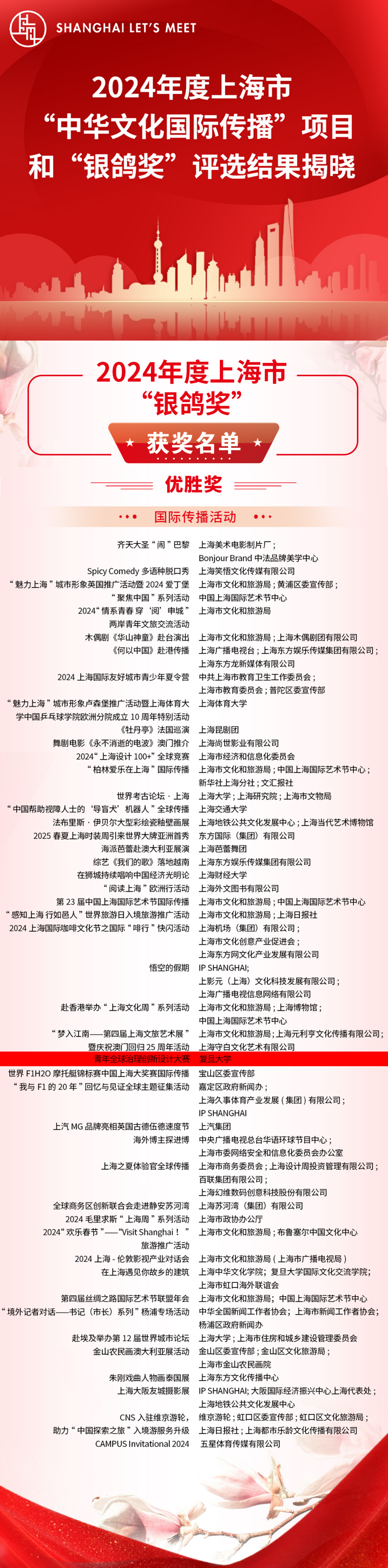 近日,2024年度上海市“中华文化国际传播”项目、上海市“银鸽奖”评选结果揭晓。经评审,54个项目入选2024年度上海市“中华文化国际传播”项目;210件作品与项目分获上海市“银鸽奖”最佳奖和优胜奖。其中,发起于2007年,由国务学院策划组织的“青年全球治理创新设计大赛”荣获2024年度上海市“银鸽奖”优胜奖。