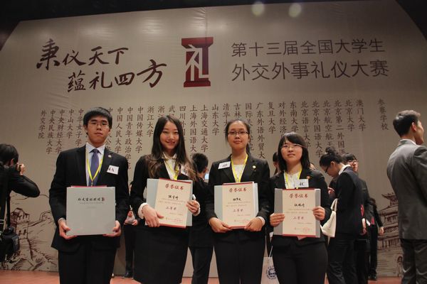 图为复旦选手在决赛现场合影留念(左起:杨雨清、陈宇婷、姬梦迪、祝姝婷) 11月27日中午,在文科楼608会议室,获知喜讯的国务学院团委学生会派选了干事,对四位选手进行了气氛热烈的专访。 问:当时是什么驱使了你们来报名参加此次比赛? 祝姝婷、姬梦迪(以下简称祝、姬):自己本身对外交方面非常感兴趣,作为大一的新生,希望通过这个比赛增长知识,拓宽眼界。 杨雨清、陈宇婷(以下简称杨、陈):虽然事务繁忙,但是觉得这个比赛很有吸引力,作为国政系的学生,想要挑战一下自己能不能学以致用,体验一下当外交官的感觉;喜欢北京外交学院,想去感受一下这个学校的氛围,可以说是“随心而行”。 问:请问你们赛前分别作了哪些准备呢? 姬:当时团学联帮我们联系了张骥老师来给我们做赛前辅导,还有去年参加比赛的彭依凡学姐。张老师给我们讲了一些准备的方向,包括外交礼仪、外交知识,归纳总结了近一年的大事件,还推荐了一些外交书籍,让我们去看外交部近一年的发言等等。彭依凡学姐讲了去年的一些题目,强调了外交礼仪知识的重要性。我们大致按照张老师的建议看了相关书籍补充自己的外交知识,如《外交辞典》《当代外交学》《国际礼仪》等,还有最新出版的《外交案例Ⅱ》。 杨:主要是向去年参加比赛的张亚宁学长询问相关情况,他建议我去看了参考消息全年的大新闻。 陈:我在赛前仔细阅读了近一年来外交部的相关发言和新闻,以及相关评论和看法。