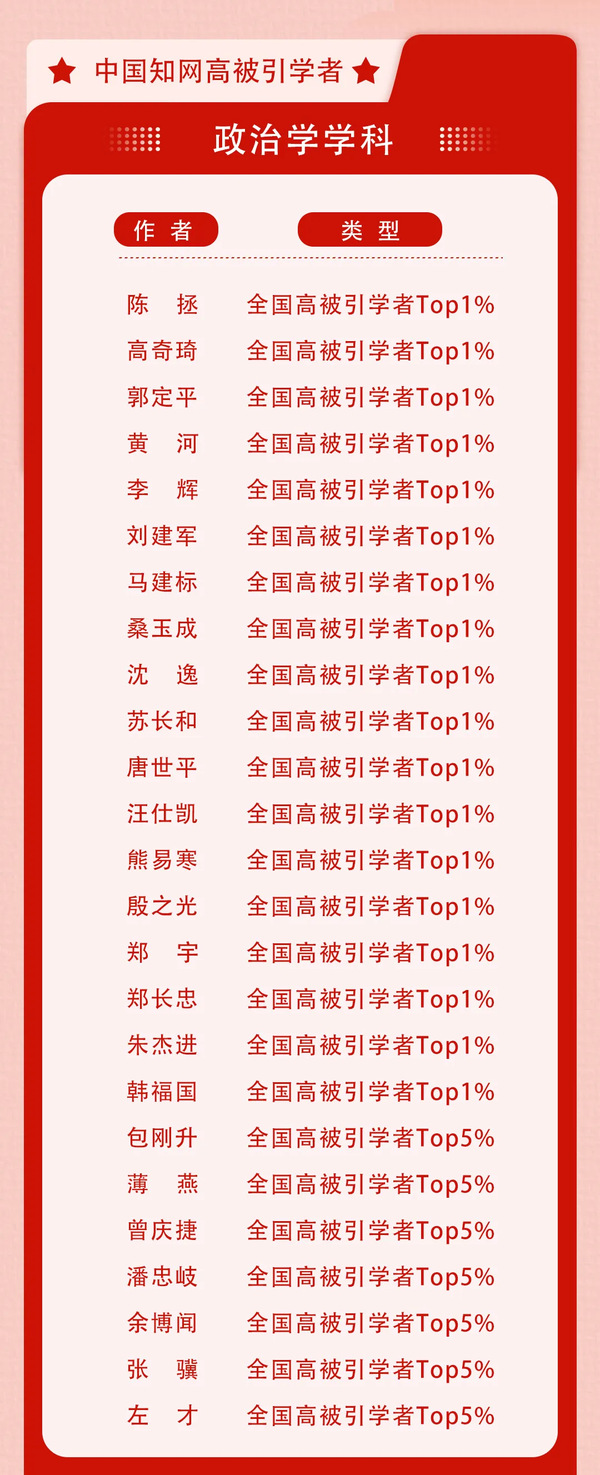 近期,中国知网公布了2025年度“知网高被引学者名单”。2025年,知网评价中心基于中国知网收录的国内学术成果,遴选出年度高被引学者,鼓励更多论文写在祖国大地上,促进我国学术繁荣发展。复旦大学国际关系与公共事务学院政治学、公共管理两学科共有40位教师入选“2025中国知网高被引学者榜单”,占全院教师总数的52%。