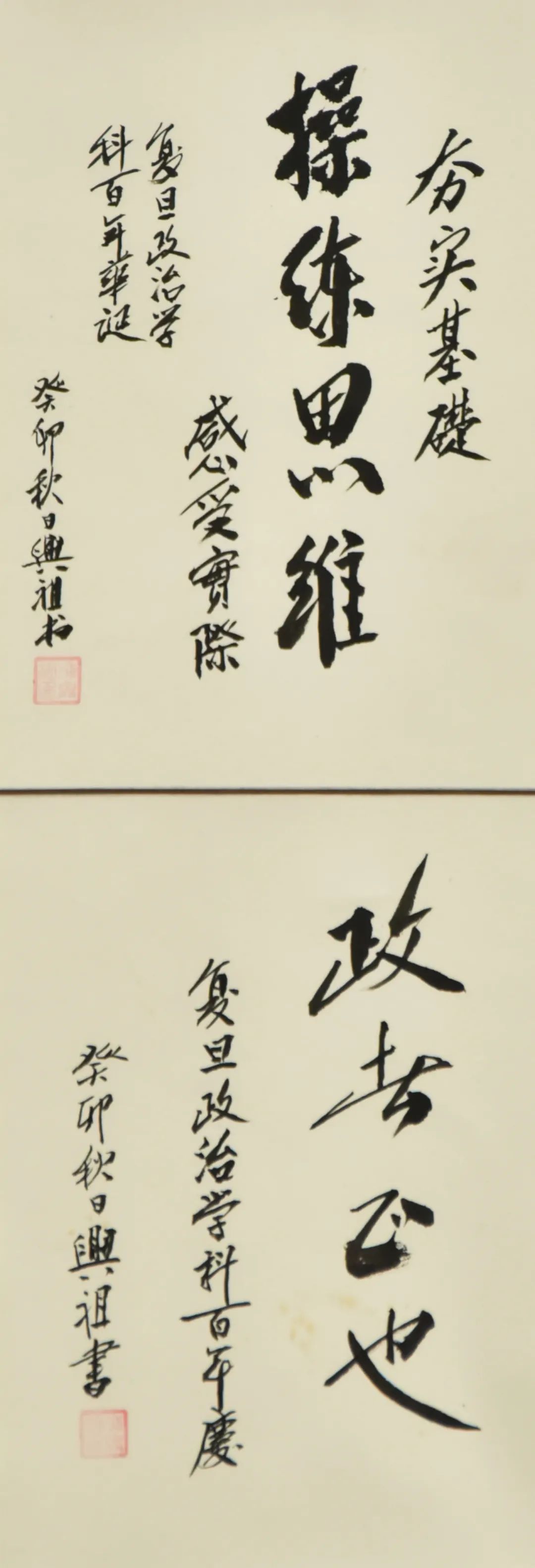 方寸之间勾勒百年政治学人风貌,撇捺行顿书尽百年政治学科征途。前辈鸿儒,史册留名;后生莘莘,英才辈出。百年政治学科,正是风华正茂,国务学院始终秉承“团结、服务、牺牲”的复旦精神,践行“博学而笃志,切问而近思”的校训宏旨,以“国箴务实,卓越为公”的国务精神为指引,作育国士,立德树人。一代代国务人投身时代洪流,踔厉奋发,接续奋进,久久为功。